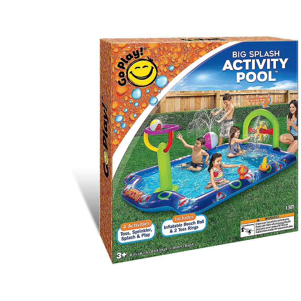 4 activities including ; 2 x toss targets, water powered spinning wheel, beach ball sprinkler and basketball hoop. (L) 241cm x (W) 168cm x (H) 84cm