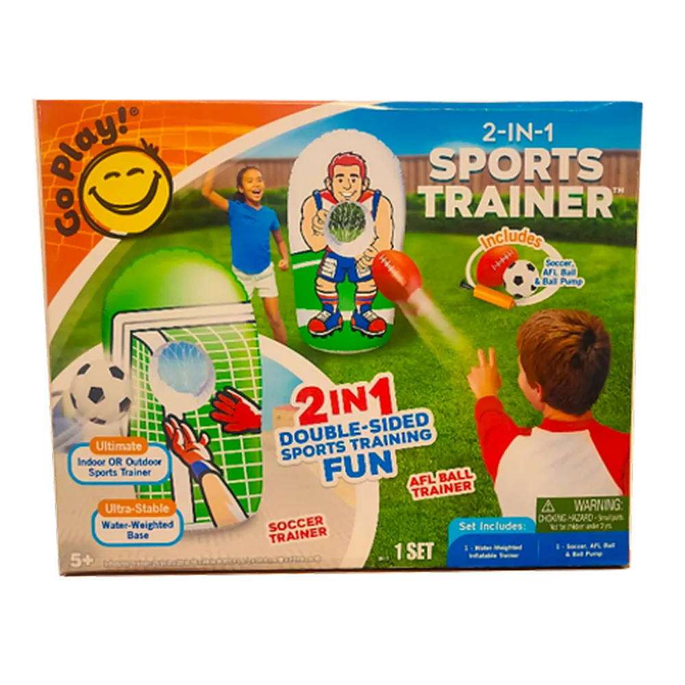 The Go Play! 2-IN-1 Sports Trainer is double sided sports training fun! Whether you feel like playing AFL or soccer this water weighted inflatable target will keep ypu enteretained for endless hours of active fun.Training hand-eye coordination, encourages active play in your very own home!