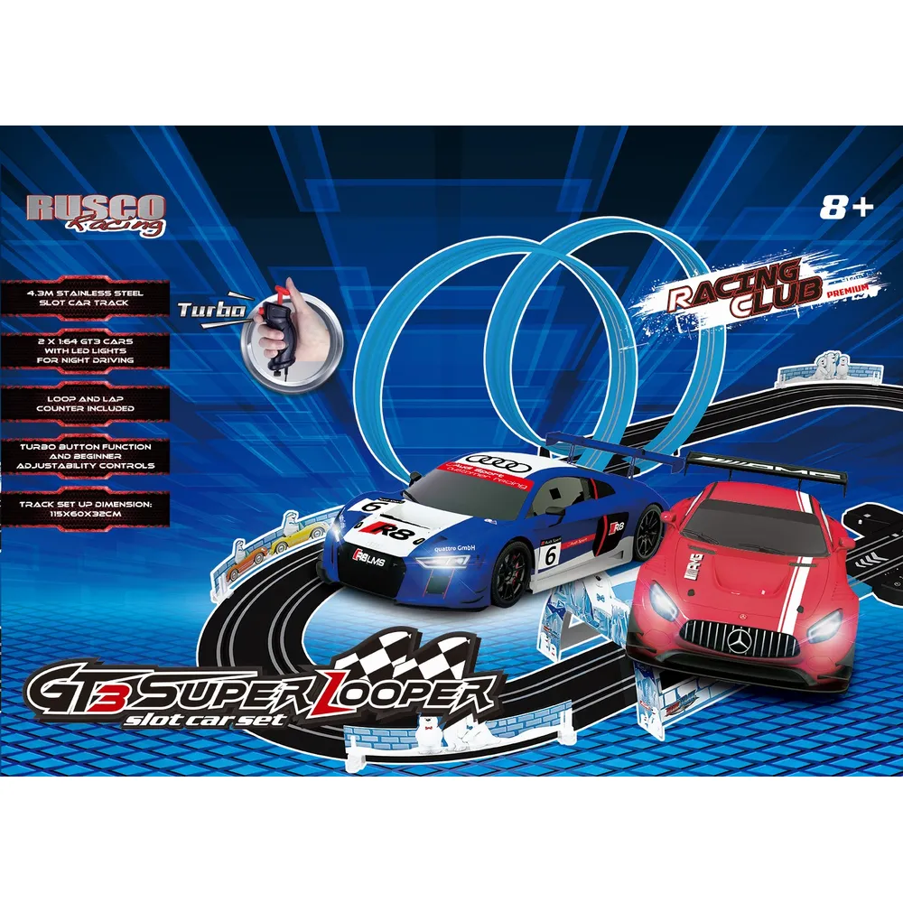 RUS-191 1:64 TH. MASERATI GTS CHASE SUPER DOUBLE LOOPER SLOT CAR SET – RTR POWER